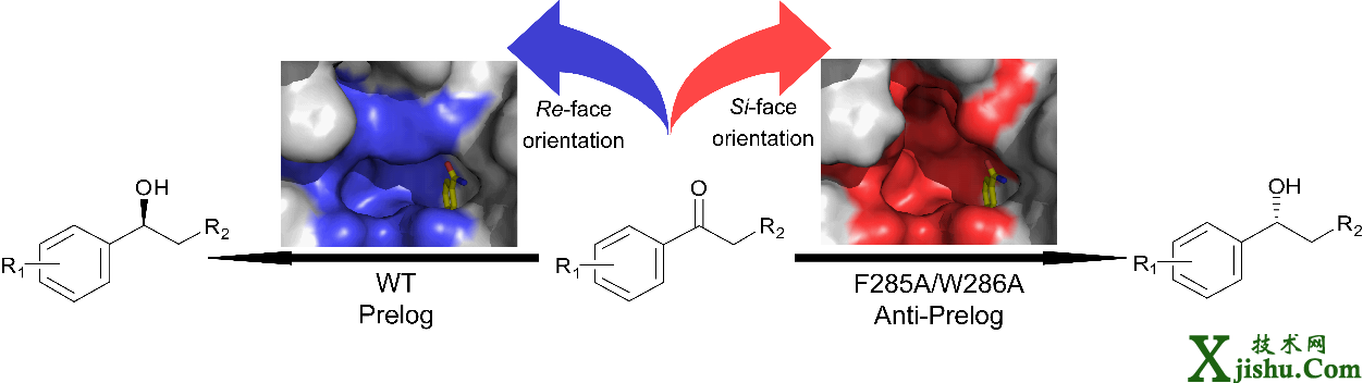 RCR屬于中鏈醇脫氫酶家族成員。結(jié)合RCR與已報道的具有立體選擇性的中鏈醇脫氫酶的晶體結(jié)構(gòu)及其氨基酸序列的比對,發(fā)現(xiàn)形成RCR的底物結(jié)合口袋的氨基酸殘基中,具有大側(cè)鏈的F285和W286分別位于小底物結(jié)合口袋的入口處和內(nèi)部,并且相對于其它成員不保守。在此兩個關(guān)鍵位點設(shè)計突變,構(gòu)建突變體F285A、W286A、F285A/W286A。功能檢測發(fā)現(xiàn),對所檢測的8種芳香酮類底物,3個突變體的立體選擇性發(fā)生了不同程度的變化。其中,雙突變F285A/W286A對8種底物的選擇性都發(fā)生了反轉(zhuǎn),特別是底物-溴代-4-氯苯乙酮的識別從re面變成si面,對映選擇性完全反轉(zhuǎn)達(dá)到>99.9% e.e.。通過模擬對接分析,進(jìn)一步解釋了立體選擇性反轉(zhuǎn)的分子基礎(chǔ)。