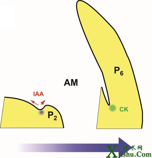 中國科學院遺傳與發(fā)育生物學研究所焦雨鈴課題組的研究表明側(cè)生分生組織的形成需要兩類經(jīng)典植物激素的協(xié)調(diào)調(diào)控。在擬南芥中,側(cè)生分生組織形成的葉腋處首先出現(xiàn)生長素的低點,此后葉腋處出現(xiàn)細胞分裂素的活躍信號。該研究進而在擬南芥和番茄中證明:先后發(fā)生的生長素低點和細胞分裂素高點都為側(cè)生分生組織的形成所必需。此外,生長素低點的產(chǎn)生依賴于PIN蛋白介導的生長素細胞外運。該工作不僅為側(cè)生分生組織的發(fā)生提供了機制上的解釋,還發(fā)現(xiàn)了一批能夠調(diào)控側(cè)生分生組織發(fā)生的基因。研究獲得的結(jié)果對于分子育種,特別是作物穗數(shù)和穗粒數(shù)的調(diào)控,有一定借鑒意義。