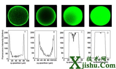 激光共聚焦顯微鏡圖像,介質(zhì)與顆粒直從左到右徑依次是DEAE-FF, 97 mm,DEAE-Capto, 105 mm, DEAE-AP-120 nm, 107 mm, DEAE-AP-280 nm, 92 mm.