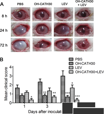 天然抗菌肽治療耐藥菌感染性角膜炎(PBS,對(duì)照; OH-CATH30,蛇毒抗菌肽治療組;LEV,左氧氟沙星治療組)