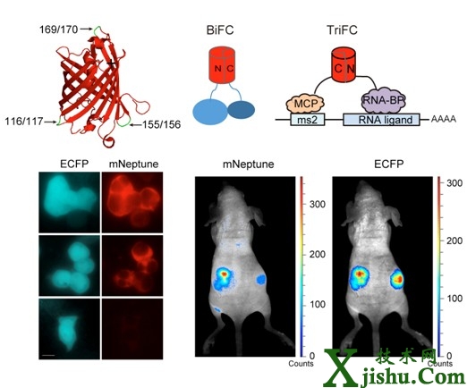 蛋白-蛋白及RNA-蛋白質(zhì)相互作用的活體成像一直是挑戰(zhàn)性的研究課題。該研究中,研究團(tuán)隊(duì)開發(fā)了激發(fā)波長(zhǎng)在600 nm以上的紅色熒光蛋白mNeptune熒光片段互補(bǔ)技術(shù),建立了位于活體成像“光學(xué)窗口”的雙分子和三分子熒光互補(bǔ)系統(tǒng)。其中雙分子熒光互補(bǔ)系統(tǒng)可以用于活細(xì)胞及活體內(nèi)蛋白-蛋白相互作用成像,三分子熒光互補(bǔ)系統(tǒng)可以用于活細(xì)胞及活體內(nèi)RNA-蛋白質(zhì)之間的相互作用成像。利用該新型熒光互補(bǔ)系統(tǒng),針對(duì)可能參與艾滋病毒“潛伏-激活”過程的人PTB蛋白與病毒mRNA之間的相互作用研究,發(fā)現(xiàn)HIV-1病毒mRNA的3’LTR區(qū)域與PTB蛋白有特異性的相互作用,并在活細(xì)胞及活體內(nèi)對(duì)其相互作用進(jìn)行了影像分析。