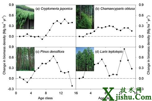在日本4種森林類型中,環(huán)境因素導(dǎo)致生物量變化隨不同齡級的變化。