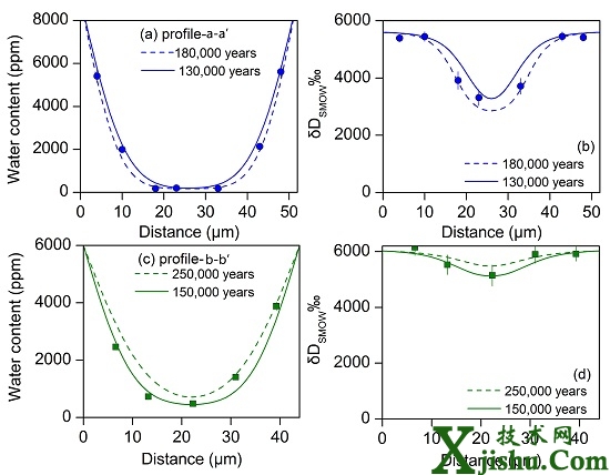 圖2 GRV 020090火星隕石巖漿包裹體的水含量和H同位素剖面。GRV 020090中的巖漿包裹體具有明顯的水含量和H同位素環(huán)帶,邊部富水,核部貧水,表明經歷了后期的水化過程。根據H擴散系數計算,液態(tài)水持續(xù)的時間約0.15 Ma。