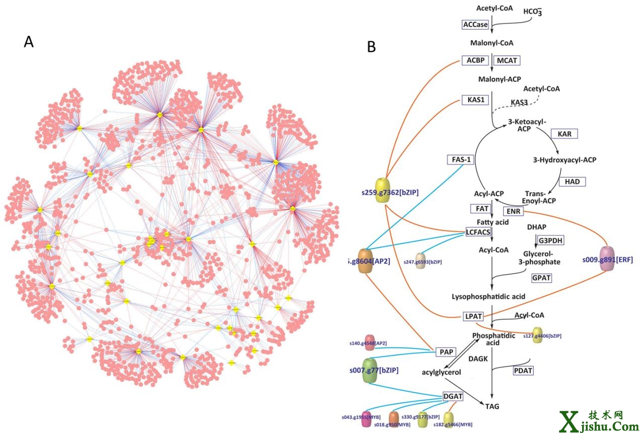 圖1 (A) 計算方法預測的微擬球藻全基因組轉(zhuǎn)錄調(diào)控網(wǎng)絡(luò),黃點代表轉(zhuǎn)錄因子,紅點代表靶基因。(B) 甘油三酯(TAG)合成途徑的轉(zhuǎn)錄調(diào)控網(wǎng)絡(luò),彩色圓柱體代表轉(zhuǎn)錄因子,紅線代表正調(diào)控,藍線代表負調(diào)控。
