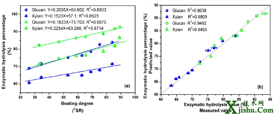 圖2 打漿度和酶水解效率的關(guān)系及通過(guò)打漿度預(yù)測(cè)玉米秸稈的酶水解轉(zhuǎn)化率