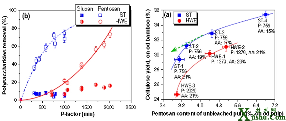 圖5. 蒸汽和熱水預(yù)處理對(duì)半纖維素溶出及纖維素得率的影響