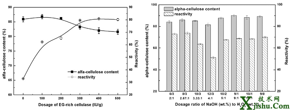 圖6. 生物酶和化學(xué)法耦合處理對(duì)纖維素反應(yīng)性能和α纖維素含量的影響
