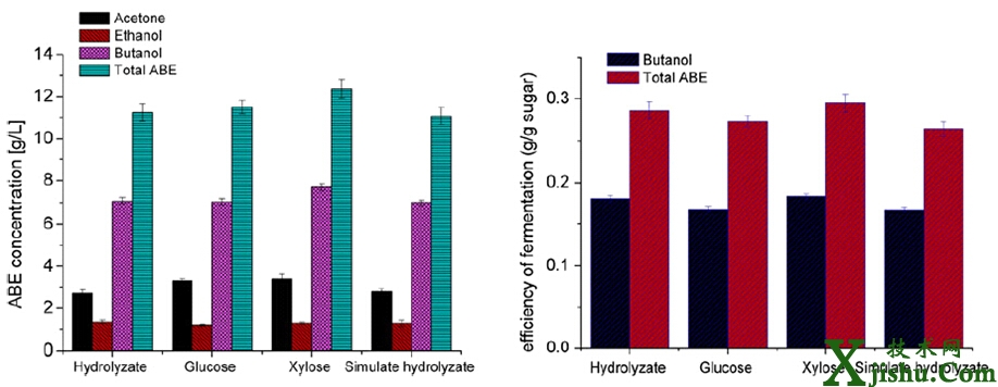 圖1. 動(dòng)態(tài)擠壓預(yù)處理玉米秸稈酶水解糖與對(duì)比糖ABE發(fā)酵性能比較