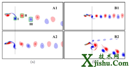 柔性對(duì)尾跡對(duì)稱性的雙重作用。(a) 柔性抑制尾跡的對(duì)稱破缺 (其中A1為剛性情況,A2為柔性情況);(b) 柔性引發(fā)尾跡的對(duì)稱破缺(其中B1為剛性情況,B2為柔性情況)。圖中A1和A2的驅(qū)動(dòng)方式相同且推進(jìn)速度相等;B1和B2的驅(qū)動(dòng)方式相同且推進(jìn)速度相等。(a)與(b)的驅(qū)動(dòng)條件和推進(jìn)速度均不同。