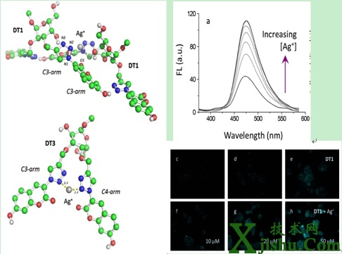 利用糖類的高水溶性、高生物相容度及結(jié)構(gòu)信息豐富等特點,研究人員通過“點擊化學”合成了一系列糖的不同側(cè)鏈位點被雙三氮唑基香豆素染料取代的熒光配體分子,發(fā)現(xiàn)在一個葡萄糖側(cè)鏈的3,4-位“點擊”香豆素可獲得對于重金屬銀離子的熒光淬滅(關(guān))信號,而在2,3-位修飾可獲得相反的熒光增強(開)信號。進一步通過熒光光譜、核磁滴定及計算模擬研究推測這一截然相反的熒光“關(guān)、開”機制主要受糖環(huán)固有的“構(gòu)象約束”性質(zhì)調(diào)控。同時證實熒光“開”型探針可在高水含量溶液中實現(xiàn)對銀離子的選擇性靈敏檢測,并可實現(xiàn)內(nèi)吞銀離子的活細胞熒光成像。