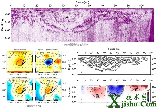 又悉,研究人員利用兩條位于阿拉斯加灣的反射地震資料,獲得了阿拉斯加灣Yakutat海表渦旋的精細(xì)結(jié)構(gòu)圖像,清晰展示了渦旋內(nèi)部細(xì)結(jié)構(gòu)及其與周邊水團(tuán)的接觸關(guān)系,發(fā)現(xiàn)渦旋底部層狀結(jié)構(gòu)與旋臂,坡折帶強(qiáng)流鋒面等現(xiàn)象。結(jié)合衛(wèi)星資料和現(xiàn)場(chǎng)水文觀測(cè)資料,研究人員對(duì)該渦旋的路徑、尺寸、形狀、水團(tuán)接觸關(guān)系、運(yùn)移和交換過程、渦旋地轉(zhuǎn)流場(chǎng)進(jìn)行了分析和計(jì)算,綜合描述該渦旋的特征(圖2),為今后研究中尺度海洋現(xiàn)象提供了一種新的觀測(cè)方法和研究思路。