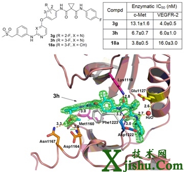 中國科學(xué)院上海藥物研究所段文虎、耿美玉和許葉春研究團(tuán)隊(duì),近年來通過藥物化學(xué)、抗腫瘤藥理學(xué)和藥物設(shè)計(jì)學(xué)之間的緊密合作開展了c-Met/VEGFR-2雙靶點(diǎn)激酶抑制劑研究,對(duì)一系列具有苯胺嘧啶骨架的化合物進(jìn)行了理性的藥物設(shè)計(jì)和生物活性評(píng)價(jià),取得了相應(yīng)的研究成果,合成的化合物對(duì)酪氨酸激酶c-Met和VEGFR-2的激酶水平的IC50均達(dá)到了nM水平,對(duì)相應(yīng)的腫瘤細(xì)胞株的IC50介于0.33-1.7μM。
