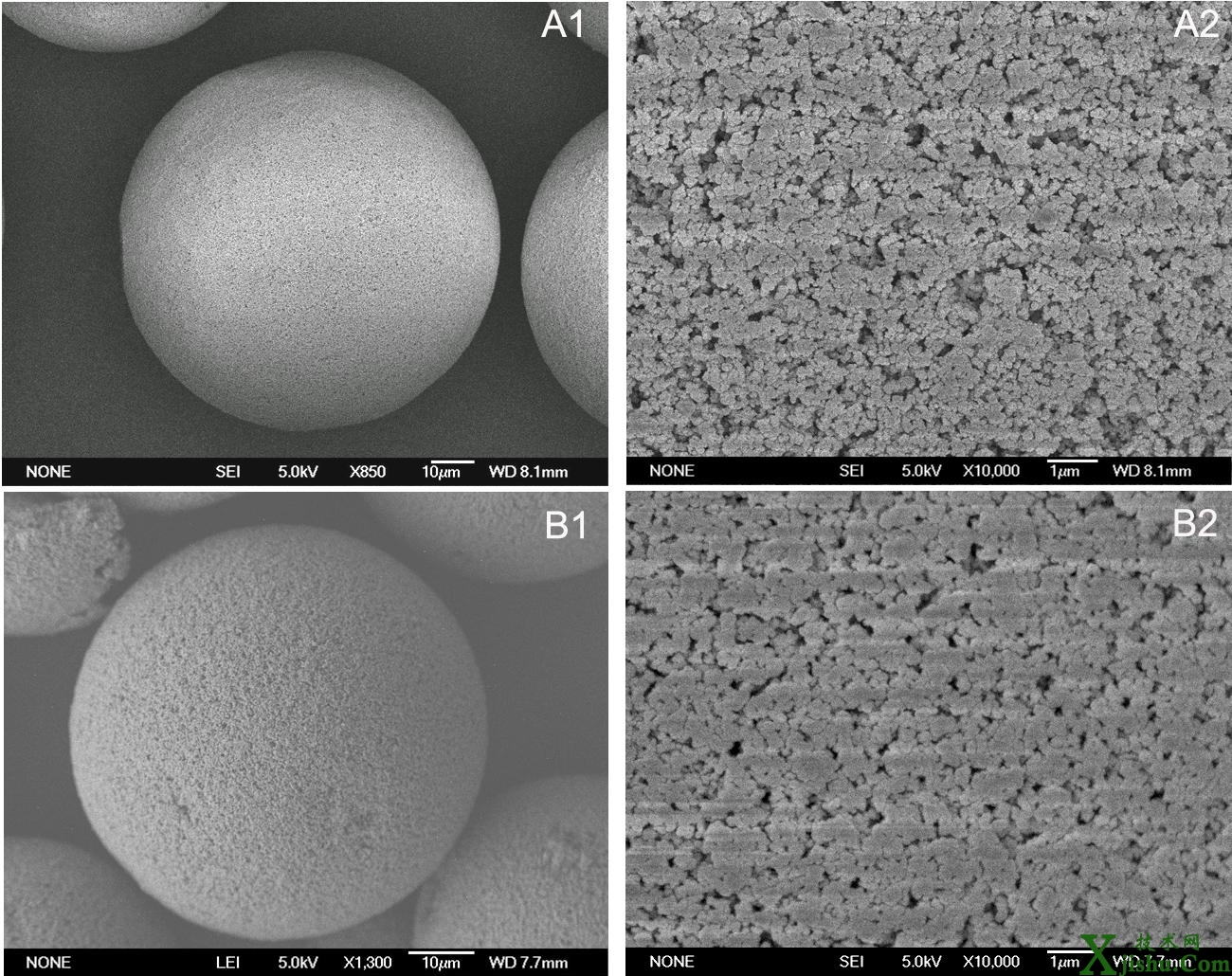 圖1. PGMA-DVB微球改性前后的SEM表面形貌圖(A1和A2為改性前;B1和B2為改性后)