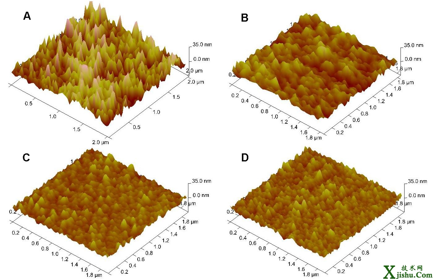 圖2. PGMA-DVB-PEI微球在不同濃度氯化鈉溶液中的AFM表面圖(A、B、C、D分別為0、0.3、0.5、1.0 M NaCl溶液)
