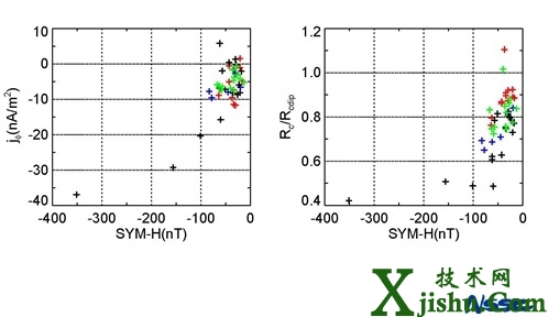 環(huán)電流(左)及磁場曲率(右)隨磁暴強(qiáng)度變化的統(tǒng)計(jì)結(jié)果