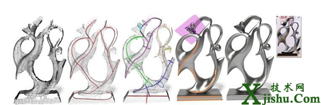 由于計算機屏幕是二維的,對幾何數(shù)據(jù)進行三維交互式處理的可控性很低。作者們通過討論和實驗發(fā)現(xiàn),如果將三維交互分解為相互正交的兩種二維交互,那么提供給用戶的可控性將成倍提高;谶@一發(fā)現(xiàn),該項研究將點云重建過程中的交互分解為兩種相互正交的曲線操作(即骨架曲線和剖面曲線),并提供了一套完整的基于這兩種曲線交互的建模理論和方法。