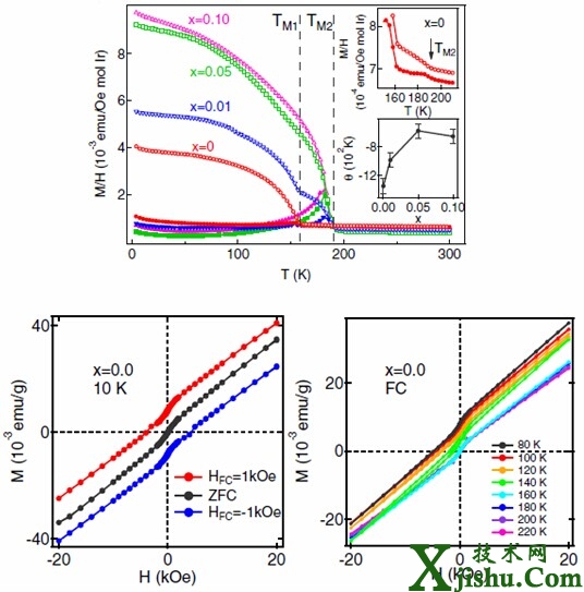 印第安納大學張世雄助理教授及其合作者考慮到從相對簡單的體系出發(fā)(并且由于理論已有預言這個化合物在全進全出的磁基態(tài)下是一個Wely半金屬),合成了Y2Ir2O7以及Ca(空穴)摻雜的樣品,通過磁性、電子自旋共振、電輸運、X射線光電子能譜等測量對這兩個樣品作了系統(tǒng)的研究。通過對比發(fā)現(xiàn),這兩個樣品中均含有Ir5+,并且Ca摻雜的樣品增強了Y2Ir2O7的弱鐵磁性,據(jù)此推斷Ir5+的存在應(yīng)該是之前普遍觀察到的A2Ir2O7呈現(xiàn)弱鐵磁性的原因,并且指出不同研究者得到不同的磁化強度隨溫度轉(zhuǎn)變曲線的原因。他們還觀察到磁化曲線(M-H)在場冷下沿M軸發(fā)生位移,并指出這可能是鐵磁相與反鐵磁背景之間的耦合造成的。