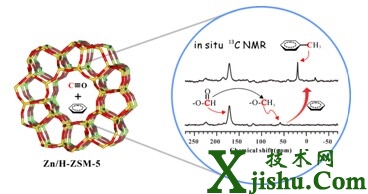 在該項(xiàng)工作中,徐君副研究員及王秀梅博士等通過調(diào)控鋅元素改性ZSM-5沸石分子篩的氧化性及表面酸性,實(shí)現(xiàn)了CO與苯催化生成甲苯的反應(yīng)。原位固體核磁共振研究發(fā)現(xiàn),CO可以作為一種烷基化試劑與苯發(fā)生烷基化反應(yīng),反應(yīng)過程中,CO通過甲氧基中間體提供了甲苯中甲基上的碳原子,苯提供了甲苯的苯環(huán)。以往的研究通常認(rèn)為CO只能作為羰基化試劑在多種催化過程提供羰基基團(tuán),該工作報(bào)道的CO可作為烷基化試劑參與目標(biāo)有機(jī)物制備的研究結(jié)果,豐富了CO作為C1原料的用途,也為高附加值化學(xué)品的合成提供新途徑。
