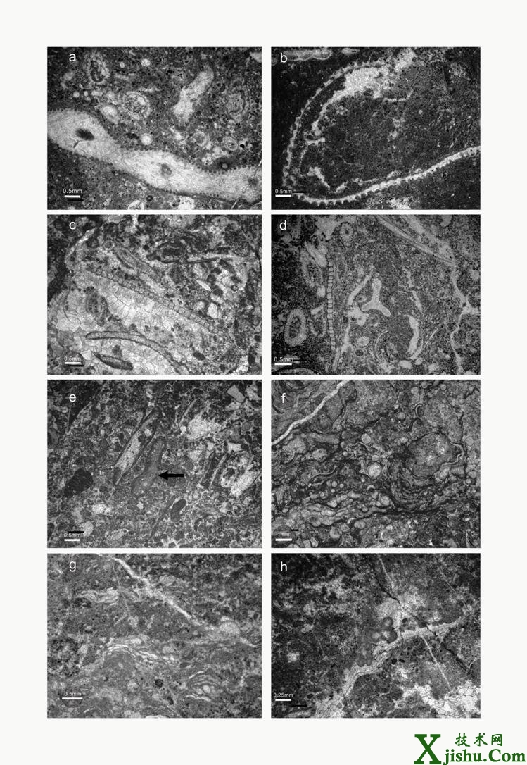 該研究通過對巴楚地區(qū)4個剖面點礁灰?guī)r露頭和實驗室微相分析發(fā)現(xiàn),巴楚地區(qū)良里塔格組礁灘復合體的生物類型以菌藻和鈣藻類為主,包括Girvanella,Renalcis,Vermiporella,Halysis,Subtifloria,Wetheredella和Rothpletzella,其中Vermiporella,Halysis是主要的造礁分子,菌藻類形成的疊層石和凝塊構造是該地區(qū)主要的礁灰?guī)r類型。
