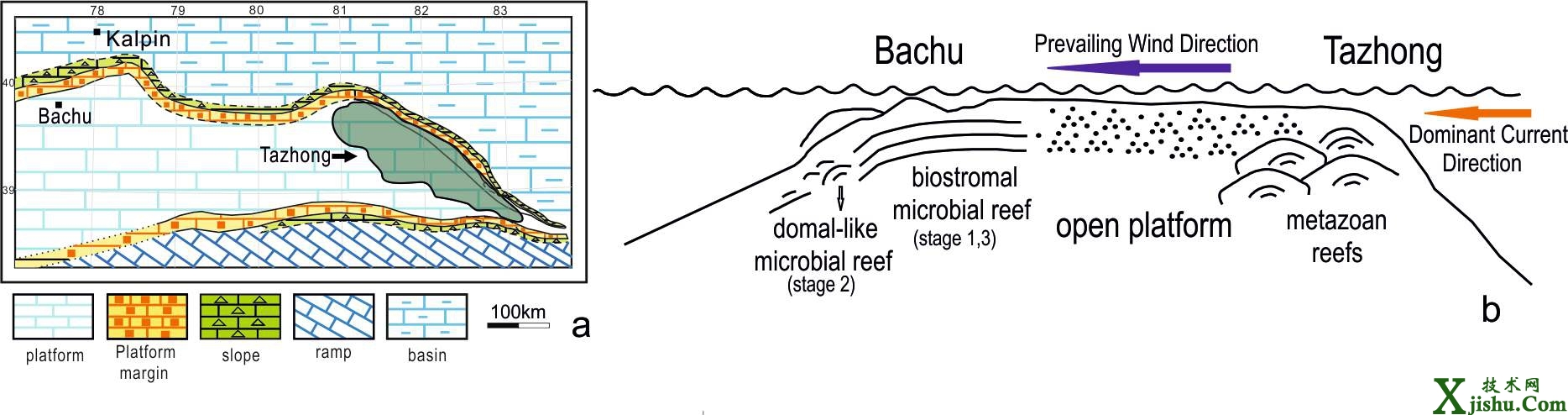 塔里木的塔中和巴楚臺地都顯示出礁前向北為廣海。塔里木在奧陶紀位于南半球,根據(jù)科利奧利茲效應,南半球低緯度海區(qū)的風向應該是盛行東南信風。按照這個基本大氣環(huán)流模式,巴楚和塔中地區(qū)的向東北廣海應該是迎風面,所以成為生物礁最適宜生長的地帶,迎風面經常受到波浪的影響,能使水體保持清潔環(huán)境而利于造礁生物繁盛,迎風面使得淺水造礁環(huán)境擾動變大,水體不易分層,而且水溫梯度變化不大,擾動的水流為該地區(qū)后生動物和其他菌藻類、鈣藻類生物提供了大量的營養(yǎng)物質,因此塔中良里塔格組能形成珊瑚-層孔蟲格架礁。巴楚地區(qū)位于背風面,水動力較弱,水流擾動能力不強,水流在經過塔中地區(qū)流向巴楚地區(qū)的過程中,溫度升高,水體溶解氧氣、二氧化碳的能力減弱,碳酸鹽巖生產量變低,而且水流帶來的營養(yǎng)物質在運移的過程中逐漸減小,所以自塔中地區(qū)經過塔中-巴楚之間地區(qū)至巴楚地區(qū),后生動物及后生動物礁逐漸減少,最終在巴楚良里塔格組形成適應于該擾動低、水溫較高、相對富營養(yǎng)環(huán)境的微生物點礁。