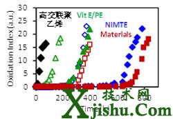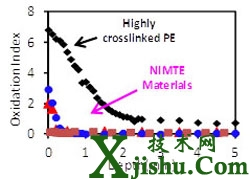 通過(guò)采用新型抗氧化劑,有效地阻斷聚乙烯的氧化通路,抑制了分子鏈的氧化降解(Polym Degrad Stab 2014, 105, 197)。與國(guó)外最先進(jìn)的維生素E穩(wěn)定的交聯(lián)聚乙烯相比,新材料在極端加速老化條件下,需要更長(zhǎng)的時(shí)間才開(kāi)始氧化,而且材料的強(qiáng)度和韌性均優(yōu)于國(guó)外同類材料(圖3, J Mater Chem 2013, 1, 4727,封面論文)。
