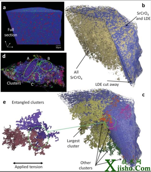 科研人員通過(guò)同步輻射X射線顯微CT與掃描電鏡及超薄切片等技術(shù)的結(jié)合,對(duì)由環(huán)氧聚合物基質(zhì)和鉻酸鍶(SrCrO4)組成的材料系統(tǒng)進(jìn)行了結(jié)構(gòu)表征,研究了聚合物中微米量級(jí)的無(wú)機(jī)粒子點(diǎn)陣的分布形式。研究結(jié)果表明,分布在聚合物基質(zhì)中的無(wú)機(jī)顆?梢孕纬刹煌笮〉莫(dú)立而又互相交織的集群,其中最大集群的分形維數(shù)為2.36。由于鉻酸鍶是水溶性的,其水溶過(guò)程形成了孔隙集群的特征模板。這樣的孔隙集群的特征對(duì)于設(shè)計(jì)航空設(shè)備的防腐蝕聚合物涂層至關(guān)重要。