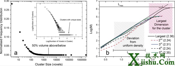 圖2: 集群統(tǒng)計(jì):(a)鉻酸鍶群的頻度分布;(b) 五個(gè)最大鉻酸鍶群質(zhì)量與尺度的分布(分形維數(shù))。