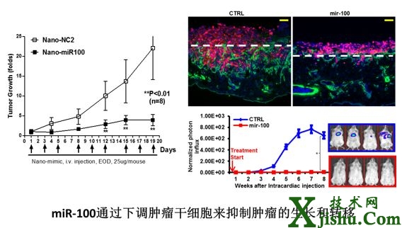 在此項(xiàng)研究中,研究人員證實(shí)miR-100參與了乳腺癌干細(xì)胞的自我更新。他們發(fā)現(xiàn),miR-100的表達(dá)水平與細(xì)胞的分化狀態(tài)相關(guān),在乳腺腫瘤干細(xì)胞中miR-100表達(dá)水平很低。利用四環(huán)素誘導(dǎo)型慢病毒在乳腺腫瘤細(xì)胞中提高miR-100表達(dá),發(fā)現(xiàn)miR-100過表達(dá)減少了乳腺癌干細(xì)胞的生成。進(jìn)一步的機(jī)制研究表明,miR-100是通過下調(diào)乳腺腫瘤干細(xì)胞的一些調(diào)控基因包括SMARCA5、SMARCD1和BMPR2等的表達(dá),在體外及小鼠移植瘤中抑制了癌細(xì)胞增殖。此外,他們還證實(shí)在原位移植或心臟注射中,立刻誘導(dǎo)miR-100可以阻止腫瘤生長(zhǎng)和轉(zhuǎn)移;并且發(fā)現(xiàn)通過納米載體可以將miR-100輸送到腫瘤干細(xì)胞里,從而抑制了腫瘤的生長(zhǎng)。在臨床上,他們觀察到乳腺癌樣本中miR-100表達(dá)與患者存活率顯著相關(guān)。