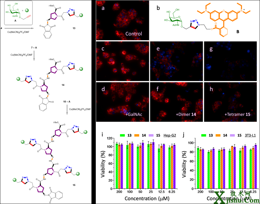 基于對(duì)肝癌細(xì)胞表面脫唾液酸糖蛋白受體(ASGP-R)靶向檢測(cè)的前期基礎(chǔ)(Adv. Mater. 2013, 25, 4097,專(zhuān)利公開(kāi)號(hào):CN 103145777 A;Sci. Rep. 2013, 3, 2293,專(zhuān)利公開(kāi)號(hào):CN 102875623 A;Anal. Chem. 2014, 86, 5502),中國(guó)科學(xué)院上海藥物研究所李佳研究組與華東理工大學(xué)陳國(guó)榮教授、賀曉鵬副研究員合作,針對(duì)傳統(tǒng)酰胺肽骨架易被酶解且水溶性差的問(wèn)題,合成了穩(wěn)定、高水溶性的氨氧肽骨架,并應(yīng)用“點(diǎn)擊化學(xué)”發(fā)展了基于此類(lèi)新骨架的多價(jià)乙酰氨基半乳糖肽模擬物。利用乙酰氨基半乳糖羅丹名染料分子實(shí)現(xiàn)了對(duì)多價(jià)糖肽與ASGP-R拮抗作用的熒光標(biāo)記,為活細(xì)胞跨膜受體與配體作用的原位檢測(cè)提供了新的光學(xué)方法;同時(shí)證明了此類(lèi)化合物具備潛在的血清穩(wěn)定性(不易被酶解)且細(xì)胞毒性低的性質(zhì),為糖疫苗的研發(fā)提供了新的核心骨架。相關(guān)工作發(fā)表于Nature出版集團(tuán)刊物Scientific Reports, 2014, 4, 5513(IF 5.078)。