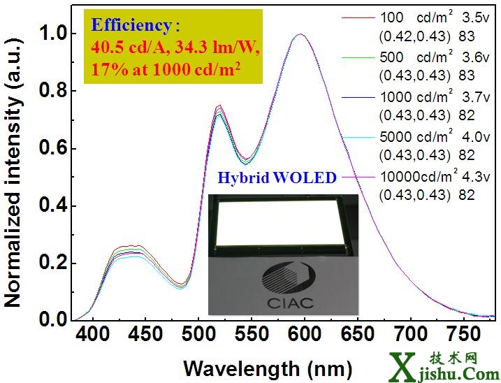 熒光/磷光混合型白光OLED的光譜及性能。圖為基于這種結(jié)構(gòu)制備的大面積發(fā)光板(150mm*75mm)