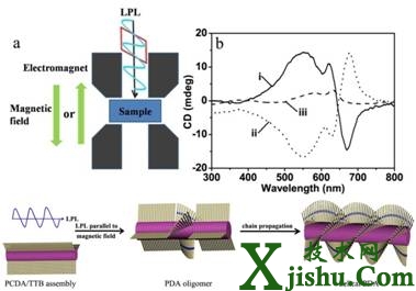 針對這一挑戰(zhàn),該課題組首次在磁場下加入與磁場方向平行或反平行的線偏振紫外光輻照聚合,實(shí)現(xiàn)了螺旋聚二乙炔組裝體的可控合成:制備的聚二乙炔組裝體CD信號與磁場強(qiáng)度成正比,且改變磁場與線偏振光方向夾角,能得到相反CD信號的螺旋聚二乙炔組裝體。研究人員利用這一體系,初步探索了其在可視化識別氨基酸對映異構(gòu)體方面的潛在應(yīng)用。該研究成果為由非手性單體出發(fā)制備螺旋共軛聚合物提供了一條新途徑,并能對探索生命科學(xué)中的手性起源問題提供參考和啟示。