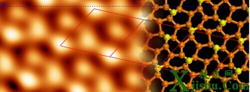。ㄗ螅╂N烯高分辨STM圖像(U = 1 V, I = 0.05 nA),(右)第一性原理計(jì)算獲得的Pt(111)上蜂窩狀鍺烯結(jié)構(gòu)的原子弛豫模型,與實(shí)驗(yàn)結(jié)果完全吻合。