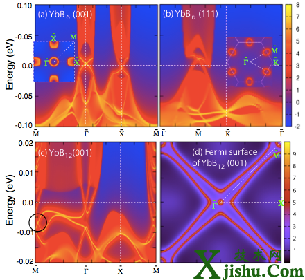 YbB6的(001)和(111)表面態(tài)具有奇數(shù)個(gè)Dirac錐形表面態(tài)。YbB12的(001)表面態(tài)及其費(fèi)米面。它有偶數(shù)個(gè)Dirac錐形表面態(tài)。