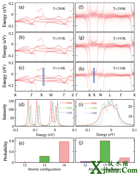 YbB6(左)和YbB12(右)電子結(jié)構(gòu)隨溫度的演變。前者能隙隨溫度變化不大,接近能帶絕緣體,后者能隙隨溫度升高關(guān)閉,是典型的Kondo絕緣體。