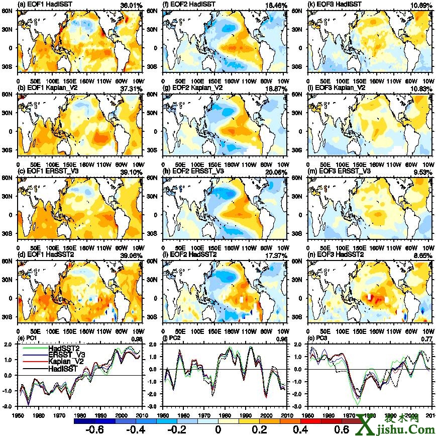 全球增暖模態(tài)、太平洋年代際變率模態(tài)、大西洋年代際震蕩模態(tài)對全球海表面溫度的作用(四套資料:HadISST,Kaplan_V2,ERSST_V3,HadSST2)。
