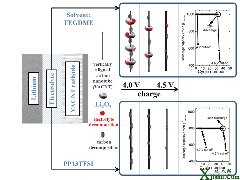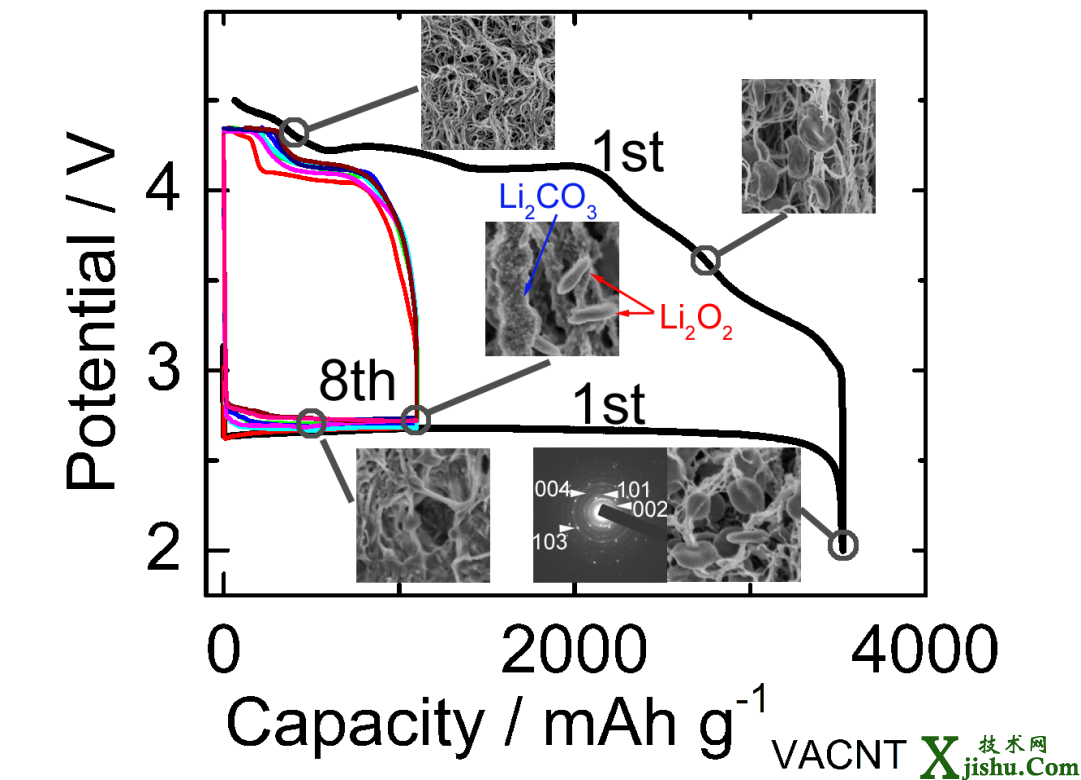 。1)針對電池的循環(huán)壽命問題,率先采用垂直定向碳納米管作為空氣電極,實現(xiàn)了關(guān)鍵反應(yīng)產(chǎn)物L(fēng)i2O2放電成核、長大以及充電溶解演變過程的可視化(如圖1所示)。揭示了空氣電極上Li2O2的可逆生成和分解是保證電池反復(fù)循環(huán)的核心,由副反應(yīng)導(dǎo)致的碳酸鹽的累積是電池循環(huán)容量衰減的主要因素(J. Phys. Chem. C,117, 2013, 2623-2627;J. Power Sources 235, 2013, 251-255)。