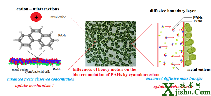在國家自然科學(xué)基金“太湖藍(lán)藻水華對多環(huán)芳烴賦存、生物富集及食物鏈傳遞的影響及其機(jī)制研究”及“含水生植物脂半透膜被動采樣裝置的研制及其在湖泊水源地有機(jī)污染物的原位監(jiān)測和生物有效性研究中的應(yīng)用”等項(xiàng)目的資助下,中國科學(xué)院南京地理與湖泊研究所陶玉強(qiáng)副研究員等首先開展了重金屬(Cu2+, Cd2+及Ag+)影響銅綠微囊藻吸附多環(huán)芳烴(菲、芘及苯并[a]芘)及其作用機(jī)理的研究,研究表明:重金屬離子與多環(huán)芳烴之間形成的陽離子-pi作用(cation–pi interactions)促進(jìn)了銅綠微囊藻對多環(huán)芳烴的吸附;陽離子-pi作用引起的吸附促進(jìn)作用隨著重金屬離子的軟度(softness order)及多環(huán)芳烴的pi電子供體強(qiáng)度增加而增大,重金屬離子對多環(huán)芳烴吸附的促進(jìn)作用呈現(xiàn)出Cd2+ ≪ Cu2+ < Ag+的趨勢,相同重金屬離子對多環(huán)芳烴的促進(jìn)作用呈現(xiàn)出菲 < 芘 < 苯并[a]芘的趨勢。在此基礎(chǔ)上,進(jìn)一步研究了重金屬(Cu2+, Cd2+及Ag+)影響銅綠微囊藻富集多環(huán)芳烴(菲、芘及苯并[a]芘)及其作用機(jī)理的研究,結(jié)果表明:重金屬離子與多環(huán)芳烴之間形成的陽離子-pi作用(cation–pi interactions)還可以有效促進(jìn)銅綠微囊藻對多環(huán)芳烴的富集;陽離子-pi作用引起的富集促進(jìn)作用也隨著重金屬離子的軟度(softness order)及多環(huán)芳烴的pi電子供體強(qiáng)度增加而增大;此外,重金屬離子還可以通過改變?nèi)芤褐腥芙庥袡C(jī)質(zhì)的性質(zhì),進(jìn)而改變水體中多環(huán)芳烴自由溶解態(tài)濃度的方式促進(jìn)銅綠微囊藻對多環(huán)芳烴的富集,此種作用機(jī)制與重金屬及多環(huán)芳烴的性質(zhì)密切相關(guān)。