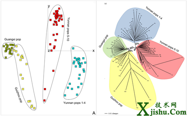 圖2 彌勒苣苔基于AFLP分析的4個分支(A: PCoA散點圖; B: 無根的NJ-tree)