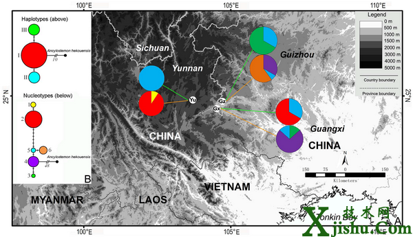 圖1 滇黔桂彌勒苣苔的分布(A)和基因型(B,上部為基于trnLF 和 matK的葉綠體倍型,下部為基于ITS的核基因型)