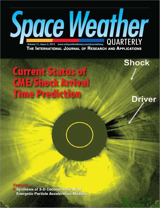 隨后,趙新華與美國空間天氣預(yù)報中心的M. Dryer博士合作撰文對當(dāng)前CME/激波到達時間預(yù)報的研究進行了評述,回顧了到達時間預(yù)報的重要性和當(dāng)前國際上主流的預(yù)報模型,重點介紹了空間天氣學(xué)國家重點實驗室自主開發(fā)的解析物理預(yù)報模式-SPM與SPM2模型,并對未來到達時間預(yù)報的發(fā)展方向進行了展望。M. Dryer博士是國際SOLTIP計劃 (SOLar connection to Transient Interplanetary Phenomena) 主席,是“Space Weather”一詞的首次使用者(Advances in Space Research, 2006, 37, 1261)。他領(lǐng)導(dǎo)團隊開發(fā)的激波到達時間“無畏預(yù)報”(Fearless Forecast)模式組是國際上最有影響力的預(yù)報模型之一。這篇題為"Current status of CME/shock arrival time prediction" 的文章發(fā)表在國際學(xué)術(shù)期刊Space Weather上(2014年12卷7期),同時被收進該雜志2014年第2期的季刊,并榮登所在月刊和季刊的封面,表明空間中心研究人員所開發(fā)的到達時間預(yù)報模式已具有一定的國際影響力。