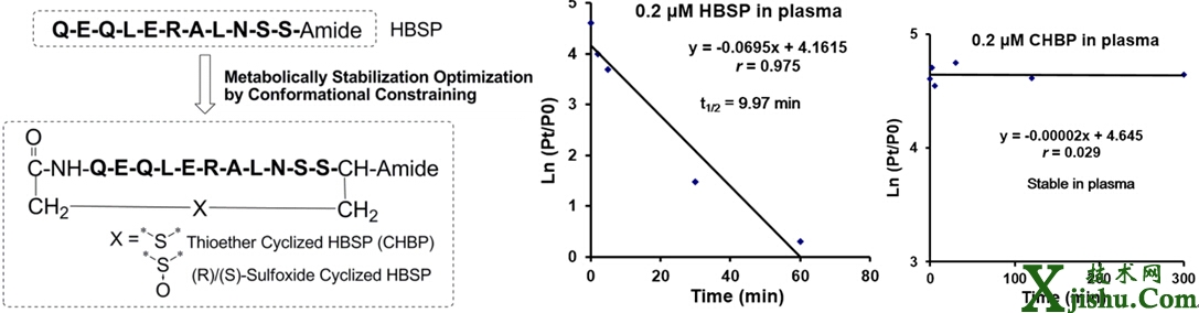 腎臟缺血再灌注損傷可導(dǎo)致腎小管上皮細(xì)胞凋亡,使腎功能嚴(yán)重受損,是腎移植手術(shù)中移植腎功能延遲恢復(fù)甚至慢性腎損傷的主要原因,嚴(yán)重影響手術(shù)效果和病人預(yù)后,目前尚無(wú)療效確切的藥物。衍生于促紅細(xì)胞生成素(EPO)b-螺旋亞基親水面的多肽HBSP在動(dòng)物模型上顯示良好的組織保護(hù)作用,且無(wú)促紅細(xì)胞生成的副作用。然而,線性肽HBSP在血漿內(nèi)易被肽酶降解,其血漿半衰期僅約2 min,極大地限制其臨床應(yīng)用。