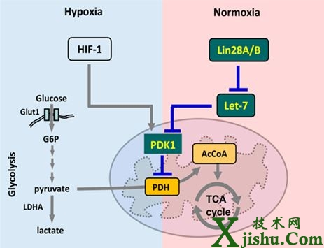 作為腫瘤特征之一的有氧糖酵解或瓦伯格效應(yīng),由著名科學(xué)家奧托·瓦博格于19世紀(jì)20年代提出。該效應(yīng)提出腫瘤細(xì)胞無論在低氧和氧氣充足的環(huán)境中,都傾向于通過一種低效的利用葡萄糖產(chǎn)生乳酸的糖酵解方式供給能量從而促進(jìn)增殖。鑒于細(xì)胞代謝是一切生命活動的重要基礎(chǔ),許多年來,這種腫瘤特異的代謝方式引起了科學(xué)家們廣泛的關(guān)注。前期的研究發(fā)現(xiàn),在低氧條件下,低氧誘導(dǎo)因子HIF-1轉(zhuǎn)錄調(diào)控代謝酶PDK1抑制三羧酸循環(huán),部分解釋了腫瘤細(xì)胞中糖酵解增強(qiáng)的機(jī)制。但這并不能解釋為什么腫瘤細(xì)胞在氧氣充足的條件下傾向于利用低效的糖酵解方式這一現(xiàn)象。研究人員以此為切入點(diǎn)展開研究,發(fā)現(xiàn)在常氧條件下腫瘤細(xì)胞通過異常表達(dá)的Lin28/let-7調(diào)節(jié)軸轉(zhuǎn)錄后調(diào)控代謝酶PDK1,對腫瘤代謝進(jìn)行重編程,從而促進(jìn)糖酵解的發(fā)生。結(jié)果表明,這條非依賴于HIF-1的腫瘤代謝調(diào)控通路影響了腫瘤細(xì)胞的體外增殖和腫瘤的體內(nèi)進(jìn)展。因此,該文的發(fā)現(xiàn)對臨床腫瘤的研究有著潛在的重要意義。