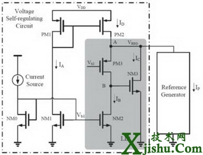 鑒于上述難點(diǎn),該論文提出了一種新型自穩(wěn)壓技術(shù),在不使用濾波電容、LDO以及運(yùn)算放大器的情況下實(shí)現(xiàn)了一款高電源抑制比的基準(zhǔn)源。采用新型自穩(wěn)壓電路為基準(zhǔn)源提供局部電源,在低功耗和小面積的情況下有效的提高了基準(zhǔn)源的低/高頻電源抑制比。