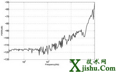 整體電路采用0.18µm標(biāo)準(zhǔn)CMOS工藝設(shè)計(jì)實(shí)現(xiàn),芯片照片如圖2所示;鶞(zhǔn)源電源抑制比測(cè)試結(jié)果如圖3所示,電源抑制比在低頻時(shí)達(dá)-115dB,在10MHz處達(dá)-90dB,測(cè)試結(jié)果優(yōu)于其他同類型文獻(xiàn)。