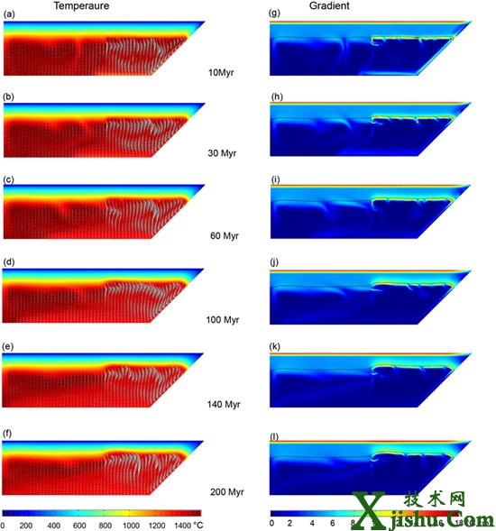 地幔對(duì)流熱侵蝕過程中溫度場(chǎng)a~f及溫度梯度g~l隨時(shí)間的演化