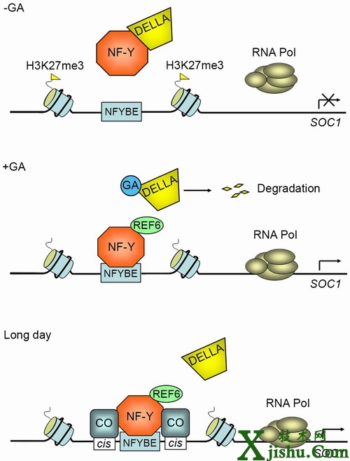中國科學院華南植物園侯興亮研究員通過與新加坡國立大學Yu Hao教授等的合作研究,發(fā)現(xiàn)擬南芥NF-Y核因子復(fù)合物通過整合發(fā)育和環(huán)境信號,從表觀遺傳層面上調(diào)控開花時間。NF-Y是在真核生物中廣泛存在的一類轉(zhuǎn)錄因子,由三個不同的亞基組成,其與真核生物啟動子區(qū)域的CCAAT框相結(jié)合,并通過與調(diào)控因子相互作用來調(diào)控下游基因表達。在植物中,NF-Y參與調(diào)節(jié)植物包括逆境反應(yīng)、胚胎和葉綠體發(fā)育、光合作用等重要生理過程。他們在研究中證實,NF-Y與光周期途徑中的CONSTANS以及GA信號通路中的DELLA蛋白發(fā)生互作,直接調(diào)控了SOC1的轉(zhuǎn)錄。這一NF-Y復(fù)合物直接結(jié)合到SOC1基因啟動子一個獨特的順式元件上,并部分通過H3K27去甲基化酶REF6調(diào)控SOC1DNA的H3K27me3修飾水平。
