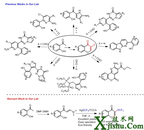 中國科學院上海藥物研究所楊春皓研究組在進行新型抗腫瘤藥物研發(fā)的同時,還積極致力于以生物活性為導向的雜環(huán)合成方法學研究,為研究組的新藥發(fā)現(xiàn)奠定化學基礎(chǔ)。研究組利用一些人們熟知的、簡單易得的有機小分子(如苯乙腈類,鄰羥基苯乙酮類——an old dog)為起始原料,發(fā)展新的方法(New tricks)用以快速構(gòu)建結(jié)構(gòu)多樣的具有類藥性的雜環(huán)化合物。