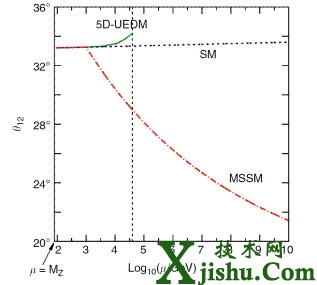 說明:上圖分別顯示了在5維時空的普適額外維模型(5D-UEDM)、標(biāo)準(zhǔn)電弱模型(SM)和最小超對稱模型(MSSM)中輕子味混合角θ12隨能標(biāo)的演化行為(引自論文Nature Communications 5 (2014) 5153)。