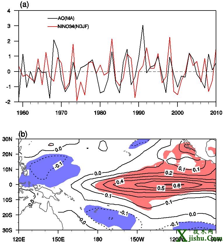 (a), 標(biāo)準(zhǔn)化的春季北極濤動(dòng)指數(shù)和隨后冬季NINO34指數(shù)時(shí)間序列。(b) 春季北極濤動(dòng)指數(shù)回歸的隨后冬季熱帶太平洋海溫異常(單位:oC)。填色區(qū)域表示回歸值達(dá)到了95%信度。