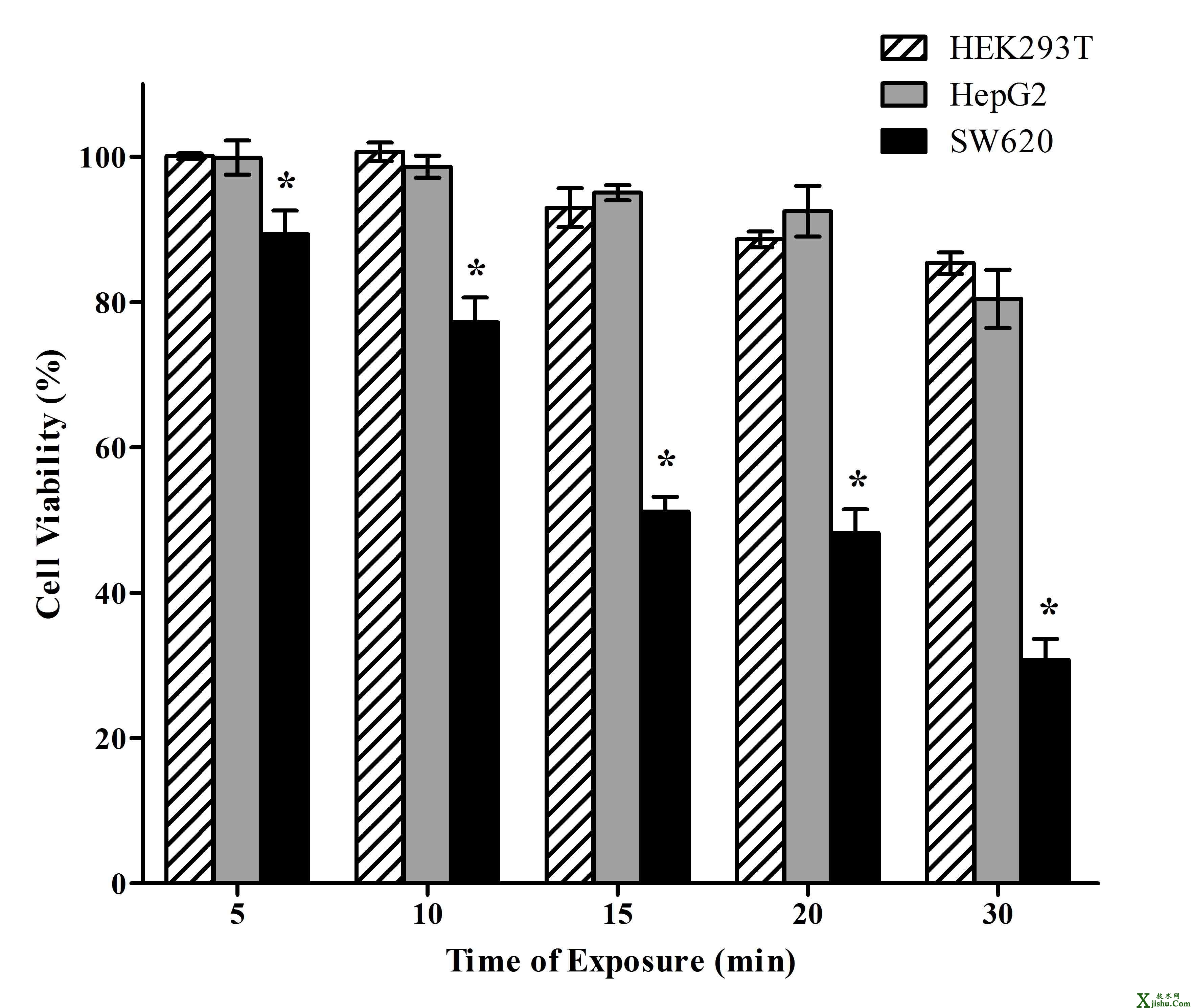 圖3. 靶標(biāo)細(xì)胞和對照細(xì)胞分別與仿病毒納米復(fù)合材料孵育,經(jīng)808 nm激光照射不同時間后的存活率